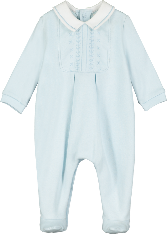 Emile et Rose Baby Boys Blue Velour Baby Grow-Front Pleats with Buttons & Collar