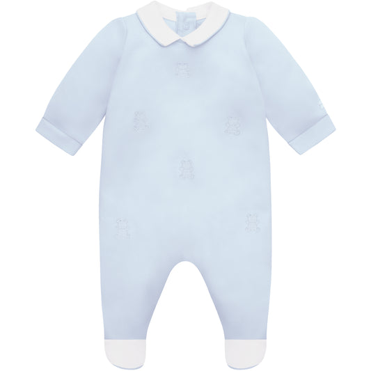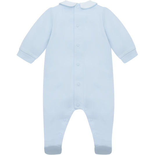 Emile et Rose Baby Boys Blue Babygrow with Pleats and Embroidered Nursery Design