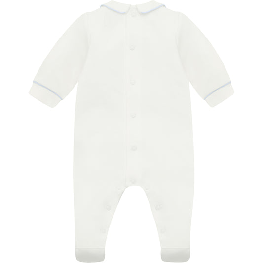 Emile et Rose Baby Boys White Babygrow with Pleats and Embroidered Nursery Design in Blue