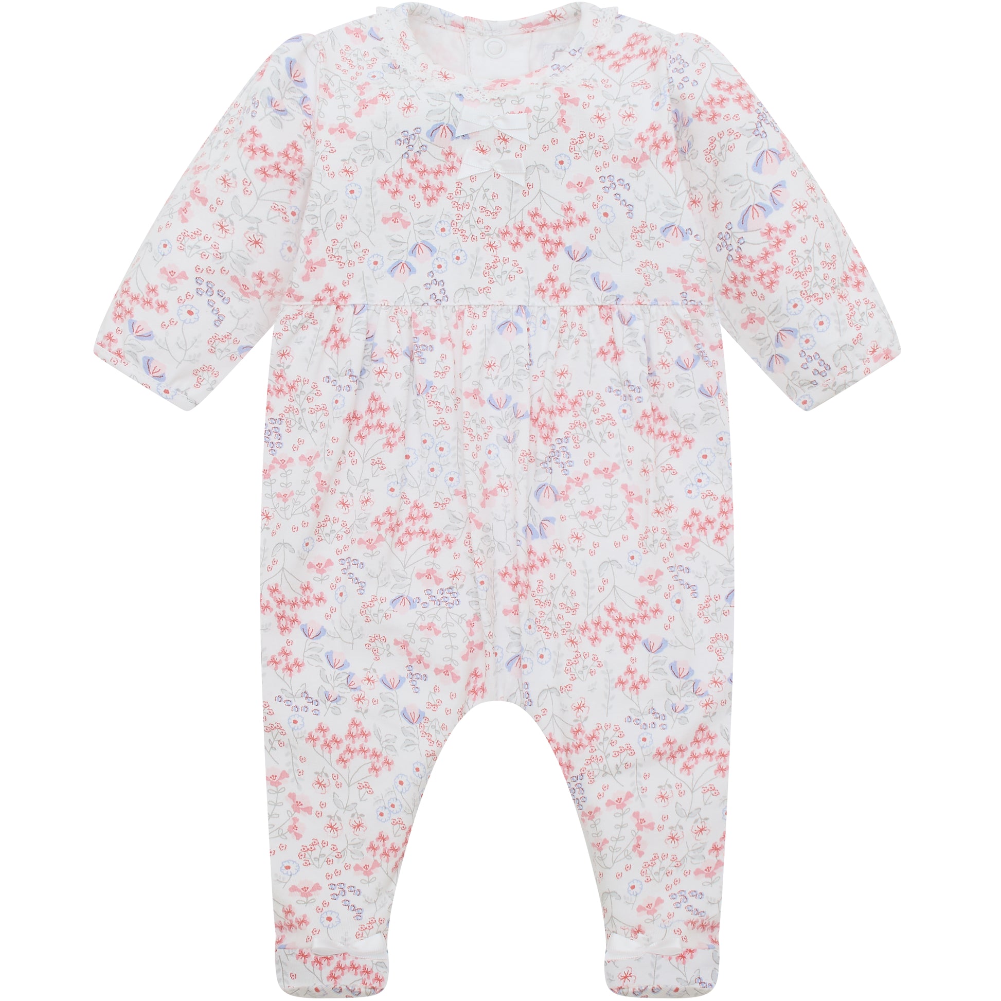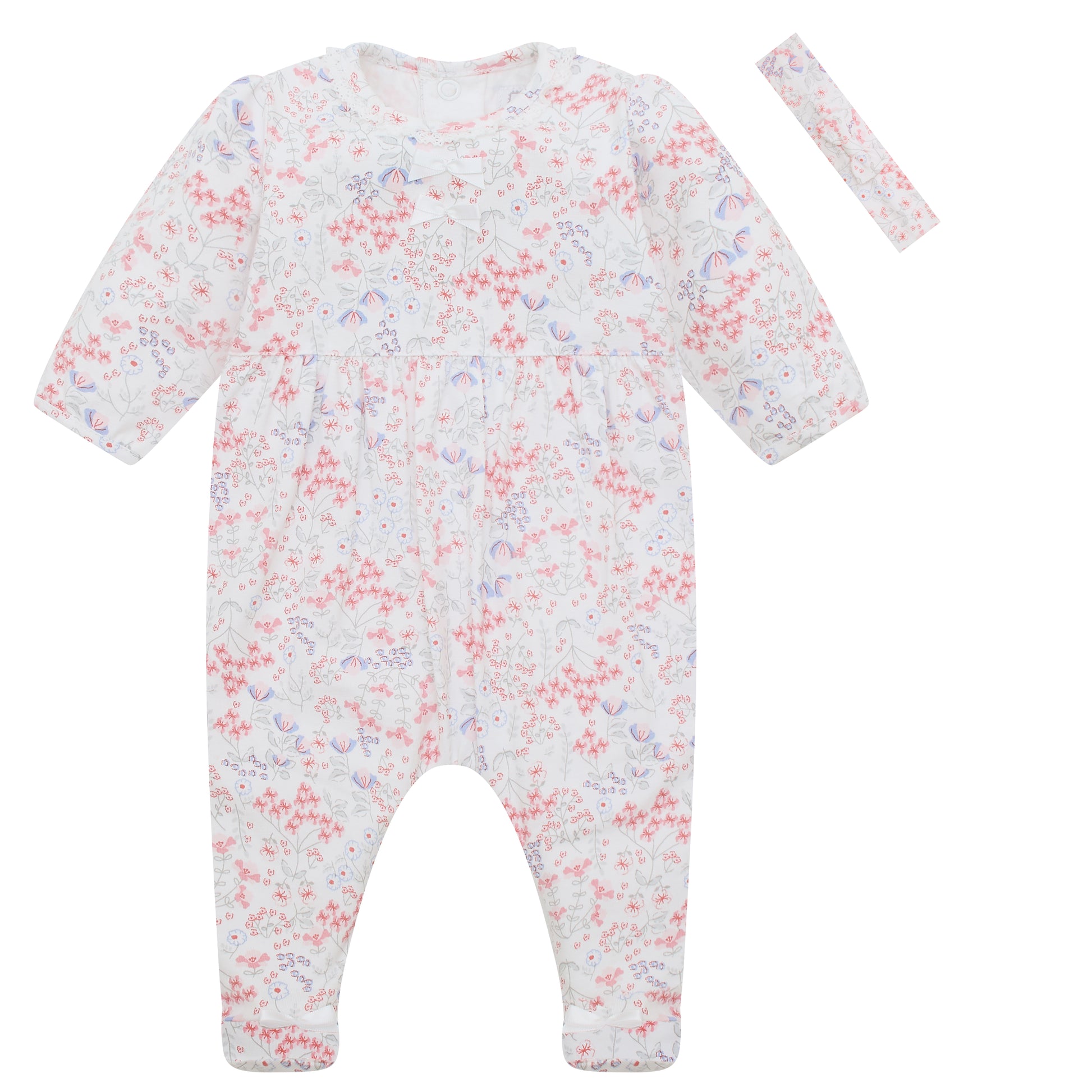 Emile et Rose Baby Girls Printed Baby Grow With Bows, Lace Trim and Hairband